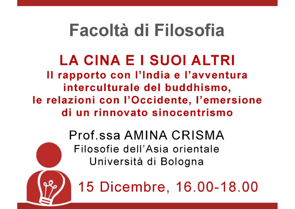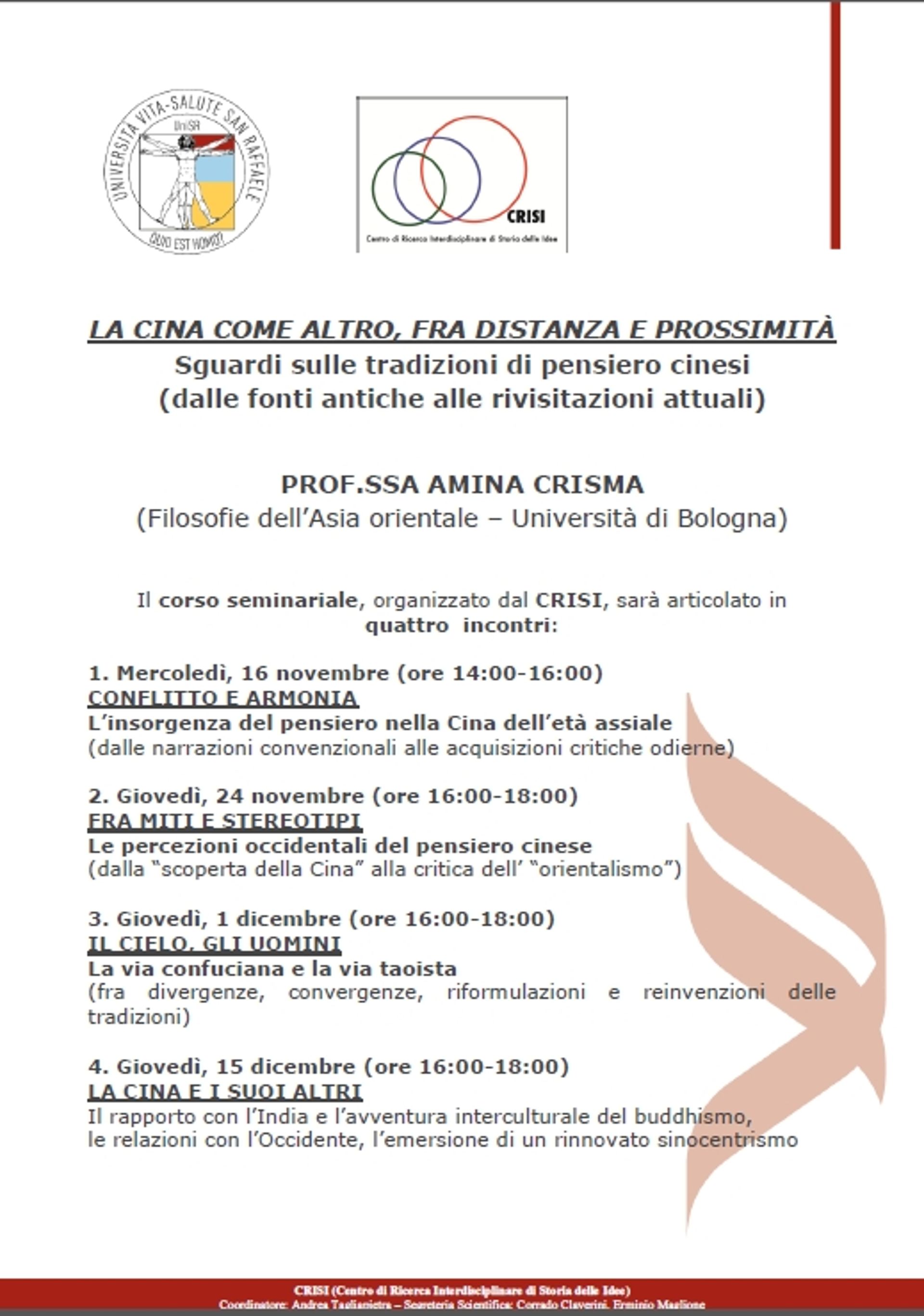 Il seminario tenuto dalla prof.ssa Amina Crisma (docente di Filosofie dell’Asia orientale presso l’Università di Bologna), composto da quattro appuntamenti e organizzato dal CRISI (Centro di Ricerca Interdisciplinare di Storia delle Idee), si occuperà d’indagare il rapporto a geometrie variabili esistente fra cultura cinese e pensiero occidentale analizzandone gli scambi simbolico-narrativi, soffermandosi, fra le altre tematiche, sul patrimonio mistico-filosofico ed etico-religioso cinese (taoismo e confucianesimo) nonché sulla ricezione da parte della filosofia continentale di questo affascinate sapere proveniente dall’Oriente.
