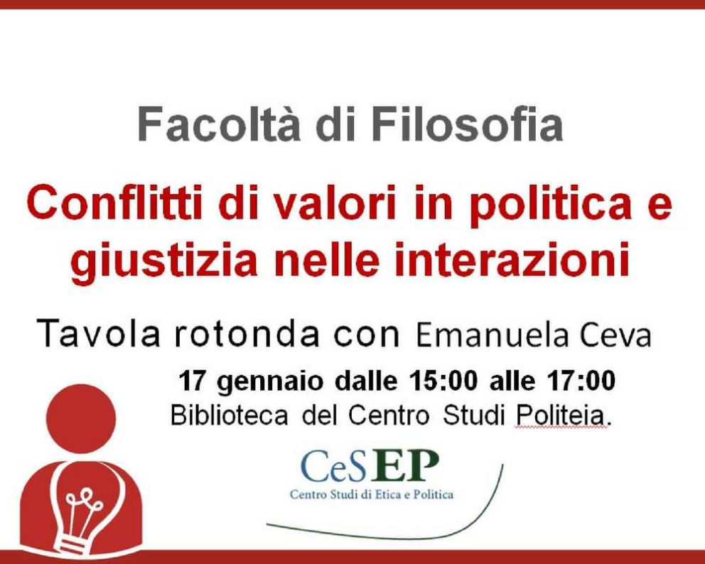 In occasione della pubblicazione del libro di Emanuela Ceva Interactive Justice. A Proceduralist Approach to Value Conflict in Politics (Routledge, 2016), il Centro Studi Politeia, il CeSEP e il Dipartimento di Scienze giuridiche “C. Beccaria” Università degli Studi di Milano hanno organizzato una tavola rotonda che si terrà il prossimo 17 gennaio dalle 15:00 alle 17:00 presso la Biblioteca del Centro Studi Politeia.