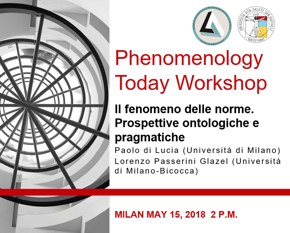 Nell’ambito del Workshop Phenomenology Today organizzato dal Centro Persona, il giorno 15 maggio 2018, dalle ore 14 alle ore 16, nell’aula Agnodice (DIBIT 1), si svolgerà il seminario tenuto da Paolo di Lucia (Università di Milano) e Lorenzo Passerini Glazel (Università di Milano-Bicocca) dal titolo “Il fenomeno delle norme. Prospettive ontologiche e pragmatiche”.