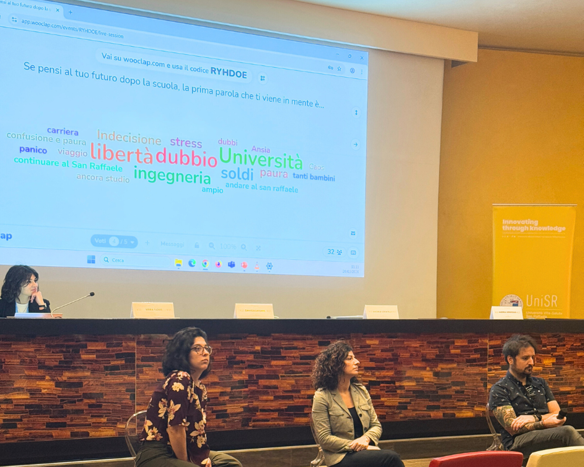 In questo contesto, durante la giornata è stata utilizzata un’app interattiva per la creazione di word cloud, attraverso cui gli studenti hanno condiviso in tempo reale aspettative, dubbi e speranze rispetto al proprio futuro. Le parole emerse – tra entusiasmo, incertezza e desiderio di trovare la propria strada – restituiscono il ritratto di una generazione chiamata a compiere scelte importanti. Le testimonianze di relatori e relatrici UniSR, che hanno raccontato anche le proprie esitazioni e i momenti di incertezza, hanno contribuito a creare un clima di vicinanza e autenticità, aiutando gli studenti a riconoscersi in percorsi non sempre lineari e a sentirsi meno soli davanti alle proprie domande.