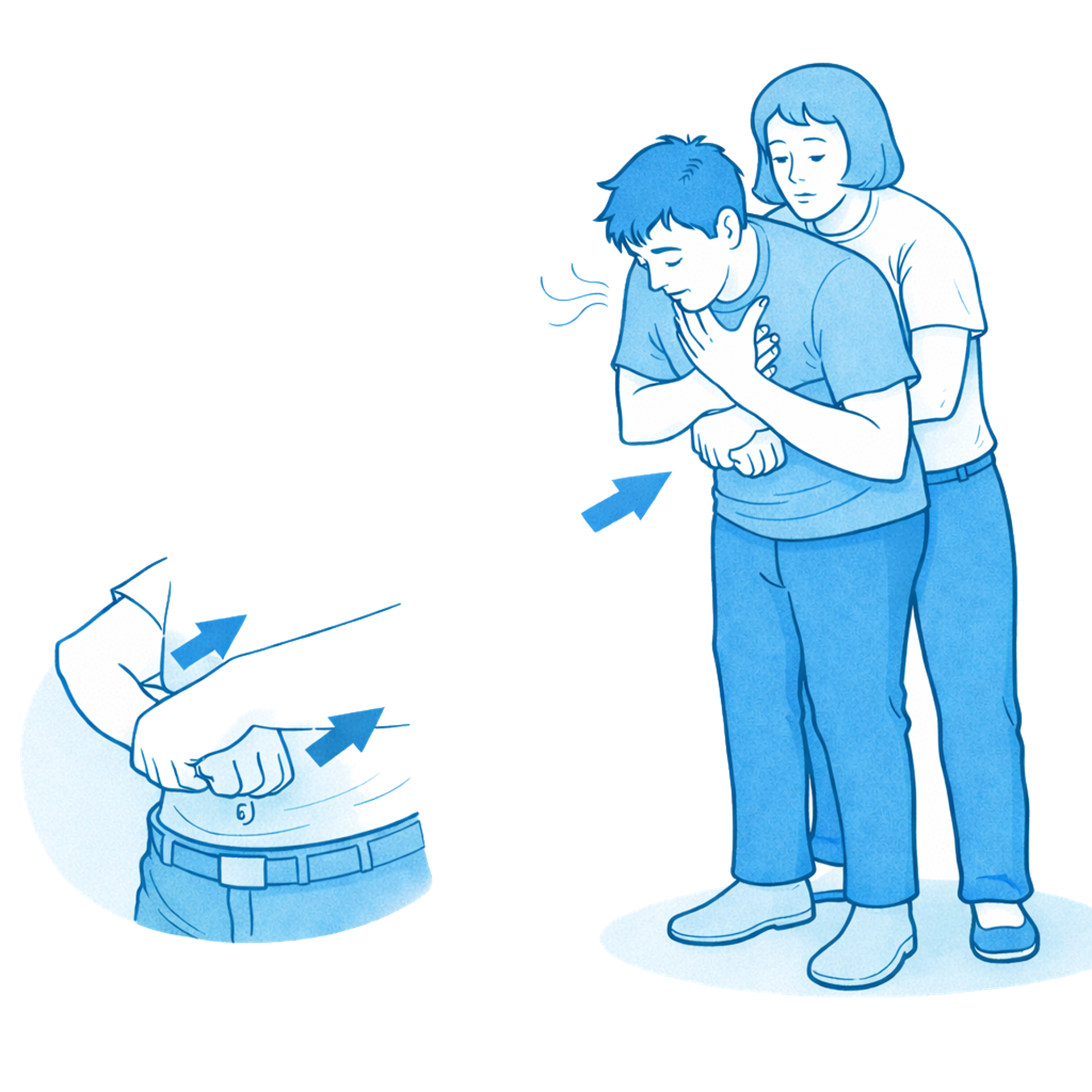 Il soffocamento si verifica quando un corpo estraneo blocca le vie respiratorie e impedisce il passaggio dell’aria. È una situazione grave che richiede un intervento immediato. Una persona che sta soffocando può non riuscire a parlare, respirare o tossire, portando le mani alla gola come segno di soffocamento. Negli adulti e nei ragazzi coscienti si utilizza la manovra di Heimlich.